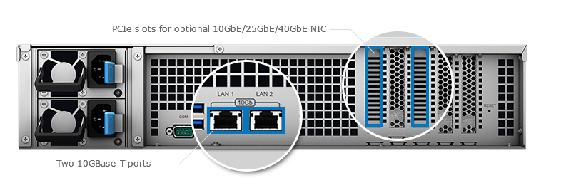 FS3017 內(nèi)建雙 10GBase-T 網(wǎng)絡(luò)端口。當(dāng)你需要更多的帶寬時,可透過兩個 PCIe 插槽新增額外的網(wǎng)絡(luò)控制器,也可選擇 10GbE、25GbE 與 40GbE 網(wǎng)絡(luò)適配器以發(fā)揮 FS3017 的效能。此外,通過額外購買 FS3017 支持的網(wǎng)絡(luò)適配器,iSCSI over RDMA 技術(shù)更可進(jìn)一步強(qiáng)化約 80% 的 iSCSI 效能。