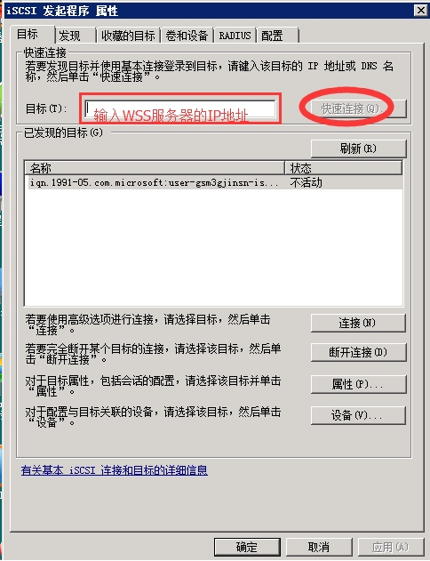 2. 打開ISCSI 配置界面,在目標(biāo)中輸入WSS服務(wù)器的IP地址,然后點(diǎn)擊"快速連接",當(dāng)連接成功后完成后續(xù)配置。