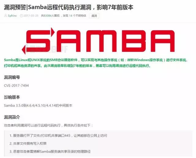 【群暉快報】2017年5月24日Samba發(fā)布了4.6.4版本,修復了一個嚴重的遠程代碼執(zhí)行漏洞,漏洞編號CVE-2017-7494。安全漏洞可以讓一個有權(quán)限的用戶提權(quán)至Samba所在服務(wù)器的root權(quán)限,進而執(zhí)行惡意程序,向該服務(wù)器發(fā)動攻擊。