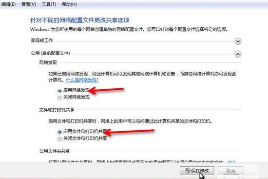 選擇 公共網(wǎng)絡(luò)---選擇以下選項(xiàng):?jiǎn)?dòng)網(wǎng)絡(luò)發(fā)現(xiàn)------啟動(dòng)文件和打印機(jī)共享-----啟用共享以便可以訪問網(wǎng)絡(luò)的用戶可以讀取和寫入公用文件夾中的文件(可以不選)----關(guān)閉密碼保護(hù)共享( 注釋:其他選項(xiàng)默認(rèn)即可!)